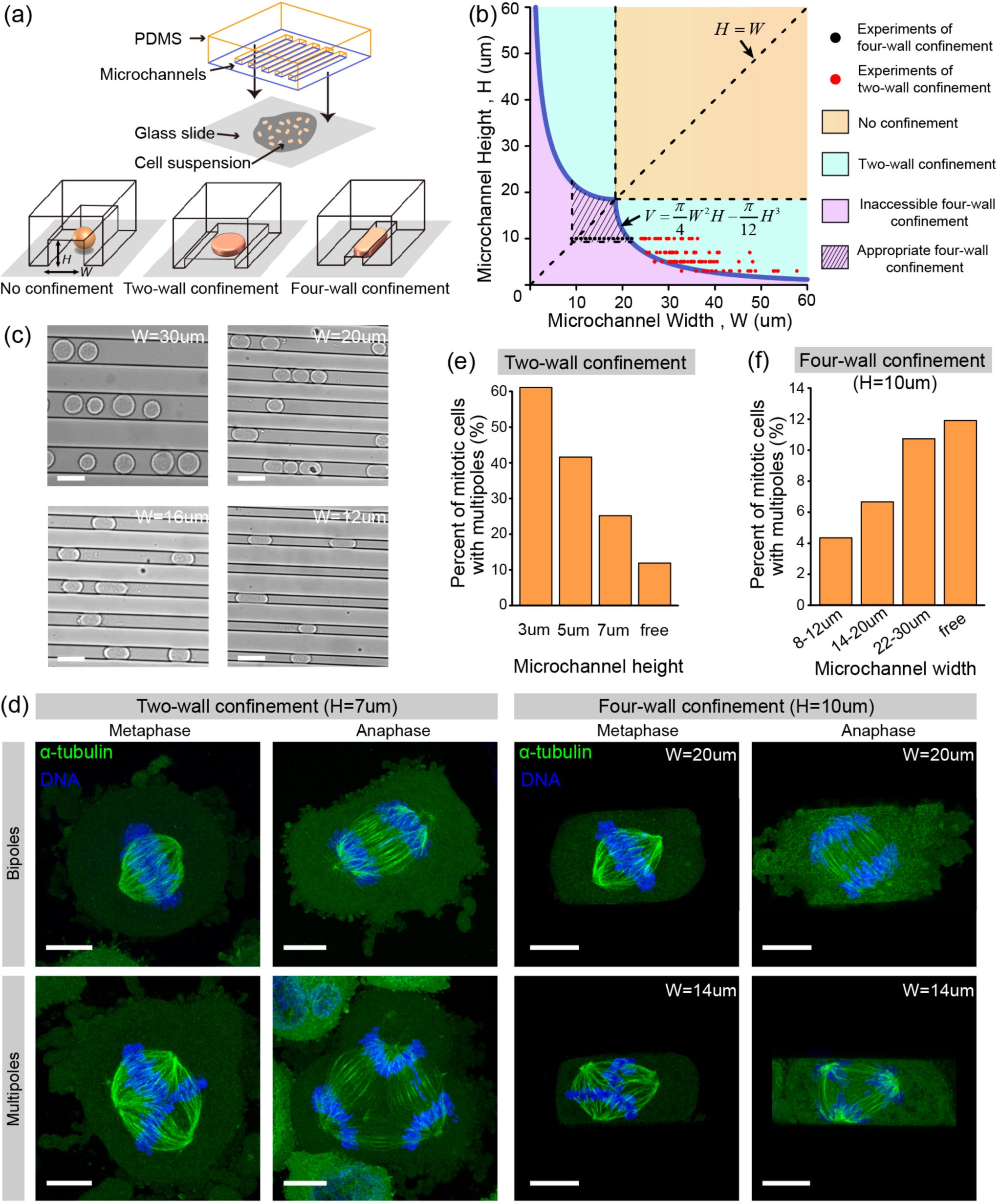 图1:两面受限内多极纺锤体出现的概率很高,而四面受限内多极纺锤体出现的概率较低。(a)实验装置图。(b)划分自由不受限、两面受限、四面受限的相图。(c)不同宽度的四面受限内细胞的显微镜明场图。比例尺为30微米。(d)两面受限和四面受限内细胞形成双极或多极纺锤体结构,并且完成细胞分裂。比例尺为10微米。(e)两面受限内多极纺锤体的统计比例。(f)四面受限内多极纺锤体的统计比例。