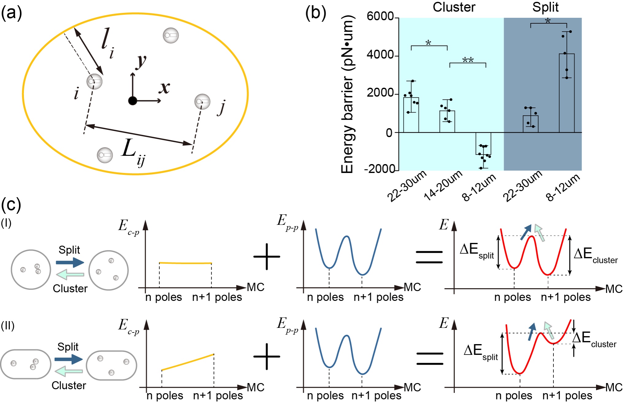 图4:理论模型揭示细胞形状调控纺锤体的劈裂与合并行为。(a)理论模型示意图。(b)计算并统计实验中的纺锤体劈裂与合并行为的能量势垒。(c)四面受限的力学环境调控纺锤体行为的机理。较宽的管道内细胞呈圆形,极与细胞皮层的距离较远,因此极与极之间的相互作用并不显著(I)。而较窄的管道内细胞呈细长形,极与皮层的平均距离较近,因而使得极与极之间的相互作用变得显著,进而增大纺锤极劈裂的能量势垒,同时也减小纺锤体合并的能量势垒(II)。