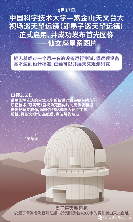 图解墨子巡天望远镜正式启用。视觉中国供图戈壁滩上的望远镜