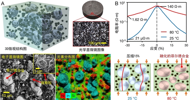 传统材料的电导率和机械刚度等物理性能往往是固定不变的。但如今越来越多的应用场景,例如软体机器人、 医疗手术设备和可重构电子器件,需要一种可根据环境变化主动调节物理性能的智能材料。由低熔点合金和弹性聚合物组成的复合材料是当前广泛采用的一种解决方案,通过在室温附近融化/凝固合金填料,复合材料可以实现软/硬和导电/绝缘之间的切换。然而,现有的此类材料往往需要外部控制装置来调节温度,不能自主响应压力或变形等环境变化。这些材料只能在绝缘体和导体间切换,而不能实现电阻的连续调节。