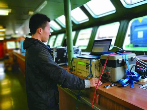 ▲乐凡阁在德国极星号科考船上调试观测仪器。 中国科学技术大学供图