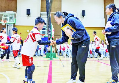 人大附中分校举行思政教育一体化建设实践活动。图为小学部排球队员和香港女排队员在友谊赛前握手。新华社发