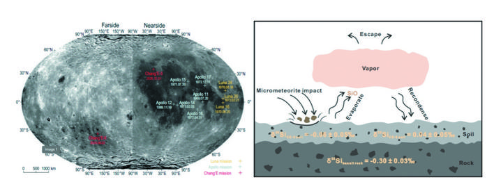 为深入评估月球正反面的太空风化的效应,研究团队利用中国科大先进的同位素分析技术,对嫦娥五号和六号返回的月壤样品进行高精度硅同位素分析,测定了来自月球正面和背面样本的硅同位素组成。研究发现嫦娥六号岩屑的硅同位素组成略重。这个差别可能产生于太空风化作用中微陨石撞击过程。