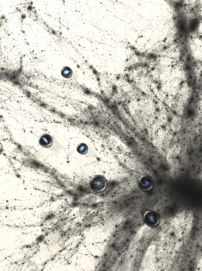 融合水墨艺术与科学可视化手法,表现宇宙大尺度暗物质分布。水珠中呈现不同环境下的矮星系图像,展示了宇宙大尺度结构与小尺度星系形成之间的复杂关联。 中国科大 供图