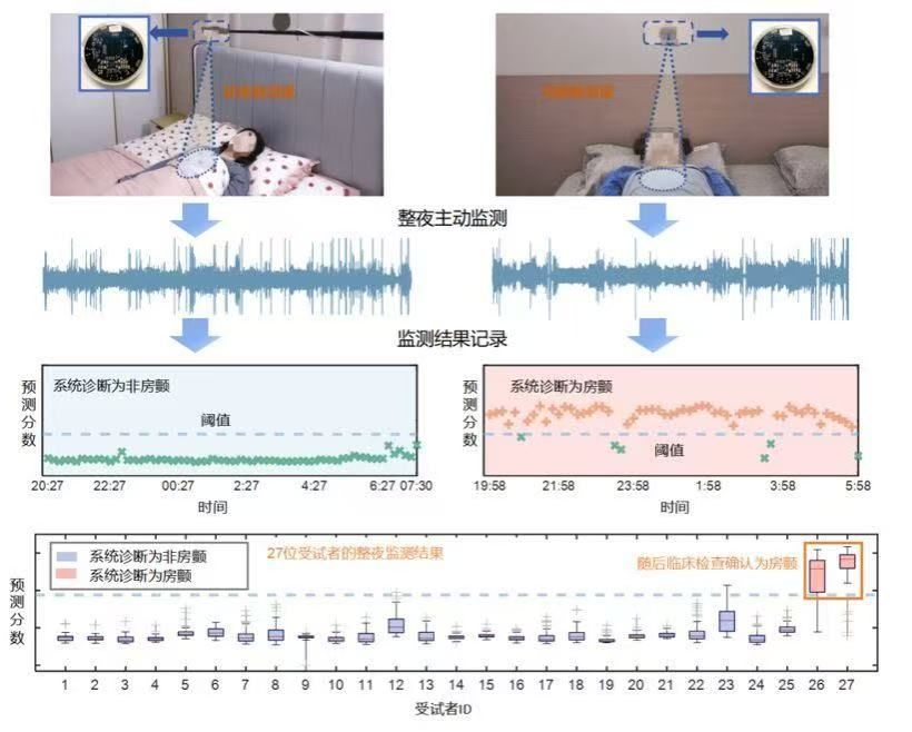 该系统在6,258例受试者中进行了测试,检测灵敏度达0.844,特异度达0.995。在对27例房颤发作高风险受试者的日常主动监测中,系统成功在临床确诊前识别出2例房颤患者。此外,该系统还能灵敏识别射频消融手术前后房颤发作的动态变化。