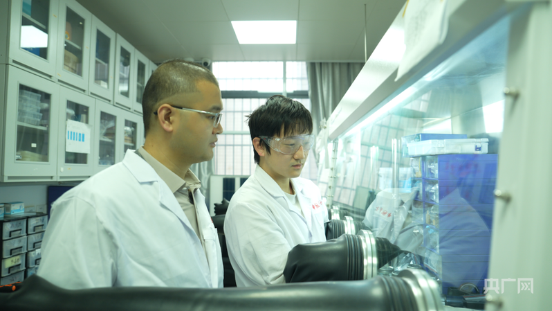 徐集贤(左)与团队成员在实验室进行电池模组研发调整(央广网记者 鲍玉婵 摄)