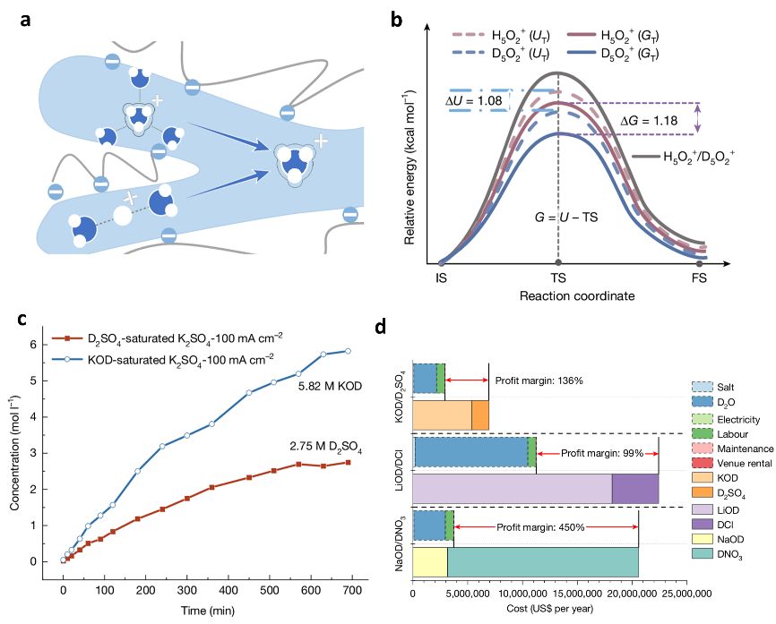 近日,中国科学技术大学精准智能化学全国重点实验室徐铜文教授、汪耀明特任教授和李震宇教授团队联合攻关,在氘代化学品制备领域取得突破性进展。他们创新性地利用双极膜技术,成功实现了低成本、高效率的氘代酸和氘代碱制备,直接把这类比黄金还昂贵的工业原料,生产成本降低了80%。