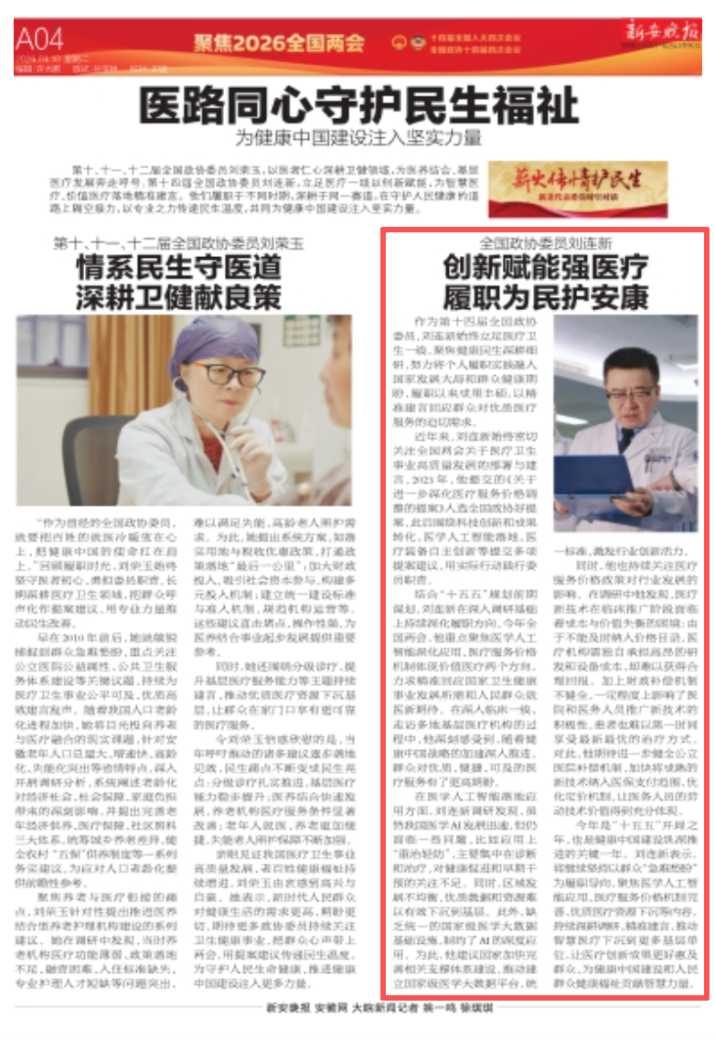 【新安晚报】全国政协委员刘连新 创新赋能强医疗履职为民护安康