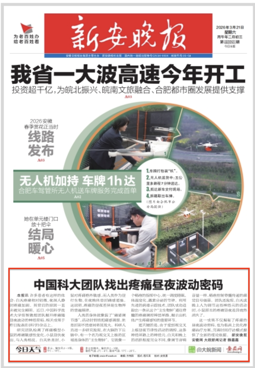 本报讯 许多患者有这样的体会:白天疼痛相对轻微,夜深人静时疼痛加剧。其背后的原因一直未被完全阐明。近日,中国科学技术大学张智教授团队揭开疼痛随昼夜波动的神经密码,相关成果于昨日发表在《科学》杂志上。