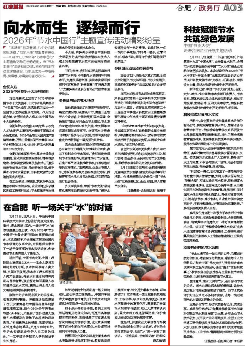 3月22日,世界水日。午后的中国科学技术大学水上报告厅内座无虚席。窗外,春水微澜;室内,一场关于“水”的思想盛宴正在上演。作为2026年“节水中国行·安徽合肥”活动的重要组成部分,本次高校学术讲座邀请到三位国内节水领域的权威专家,为现场师生带来了一场干货满满的节水知识盛宴,也给高校节水教育注入了新活力。