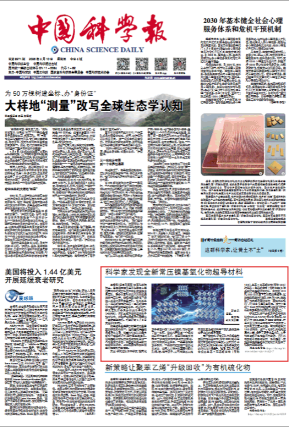 【中国科学报】科学家发现全新常压镍基氧化物超导材料