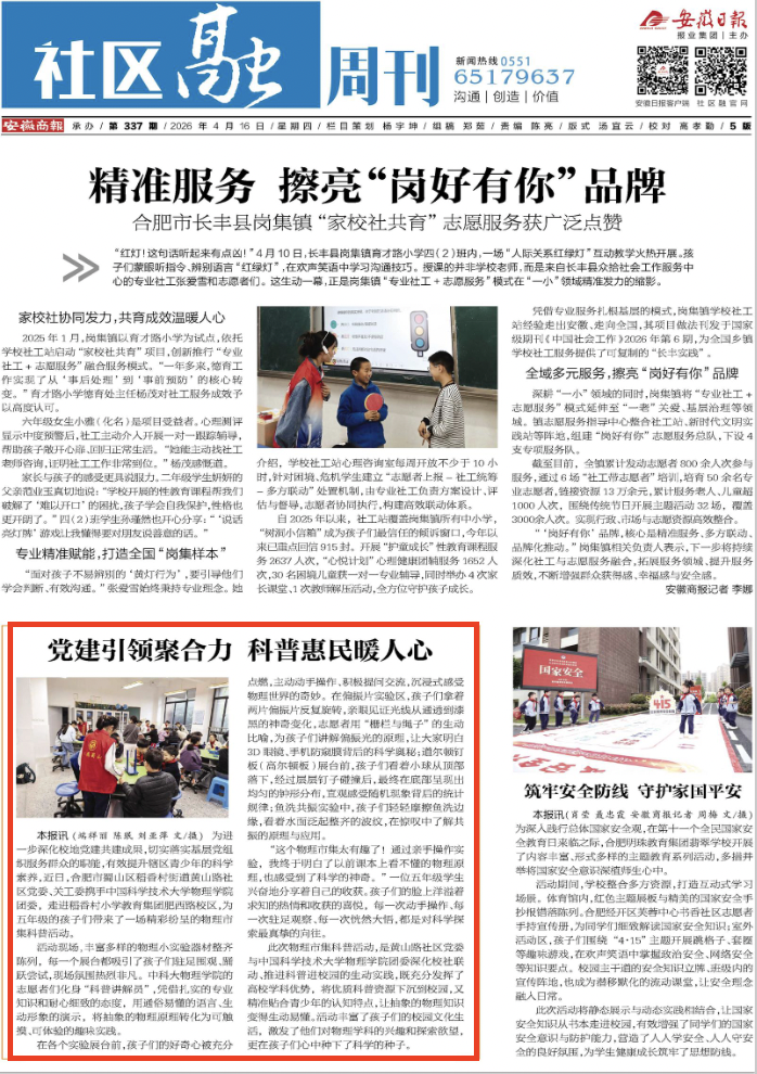为进一步深化校地党建共建成果,切实落实基层党组织服务群众的职能,有效提升辖区青少年的科学素养,近日,合肥市蜀山区稻香村街道黄山路社区党委、关工委携手中国科学技术大学物理学院团委,走进稻香村小学教育集团肥西路校区,为五年级的孩子们带来了一场精彩纷呈的物理市集科普活动。
