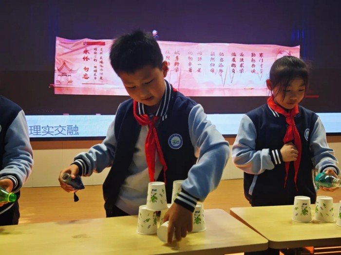 紧接着的“空气炮”实验同样精彩,孩子们轮流拉动气球膜,瞄准靶标,“空气弹”应声击倒纸杯,孩子们在欢声笑语中收获了知识与思考。